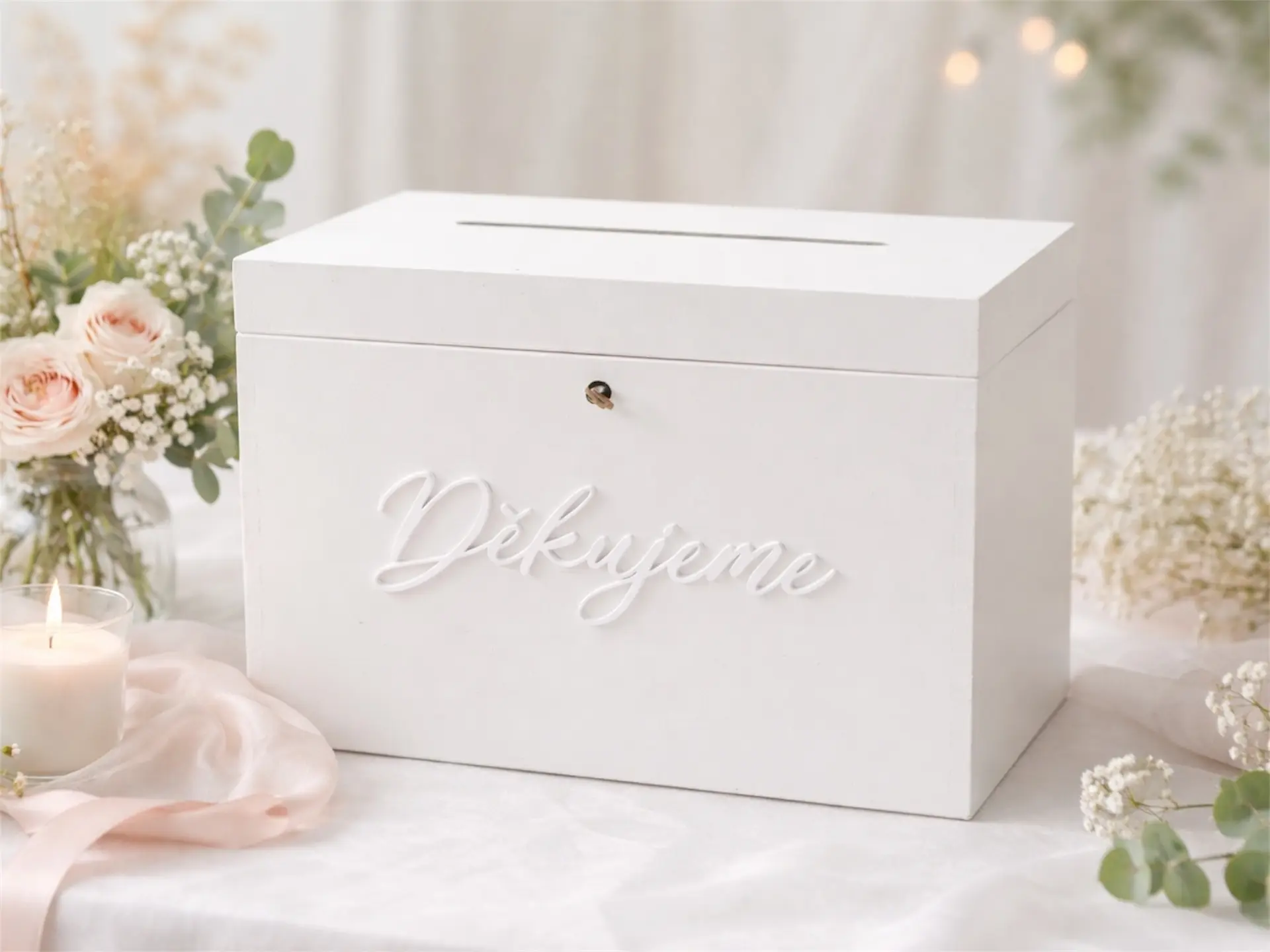 Bílá svatební truhla slouží jako bezpečné místo pro obálky, přání i finanční dary od hostů. Je uzamykatelná, takže máte jistotu, že vše zůstane v bezpečí po celý svatební den.