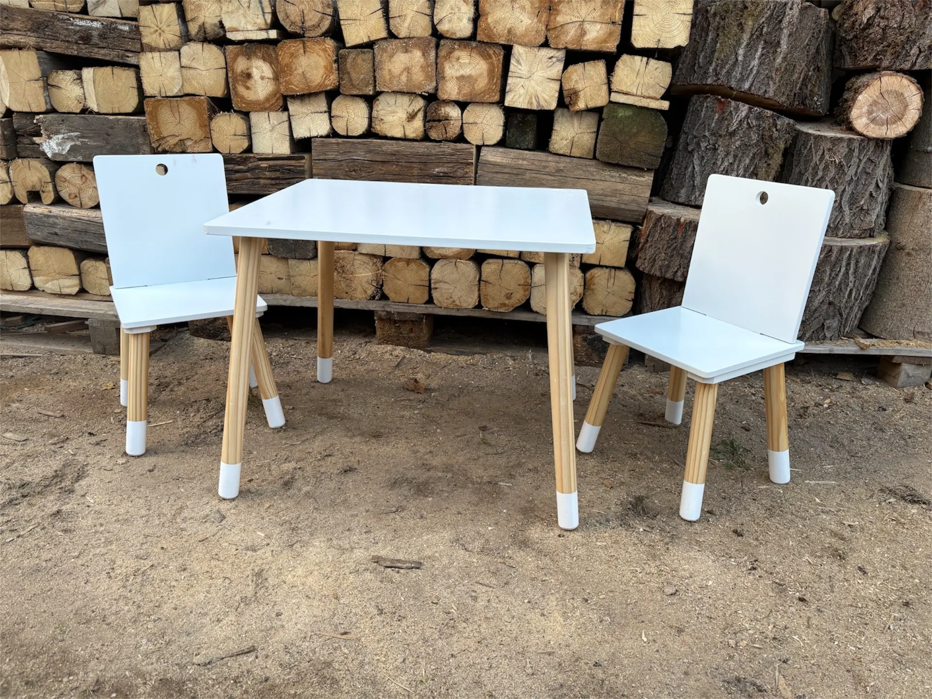 Dětský svatební set stolečku a židliček je ideálním řešením pro vytvoření dětského koutku na svatbě. Díky jednoduchému designu v kombinaci bílé a přírodního dřeva krásně zapadne do jakékoliv svatební výzdoby – od rustikální po moderní.