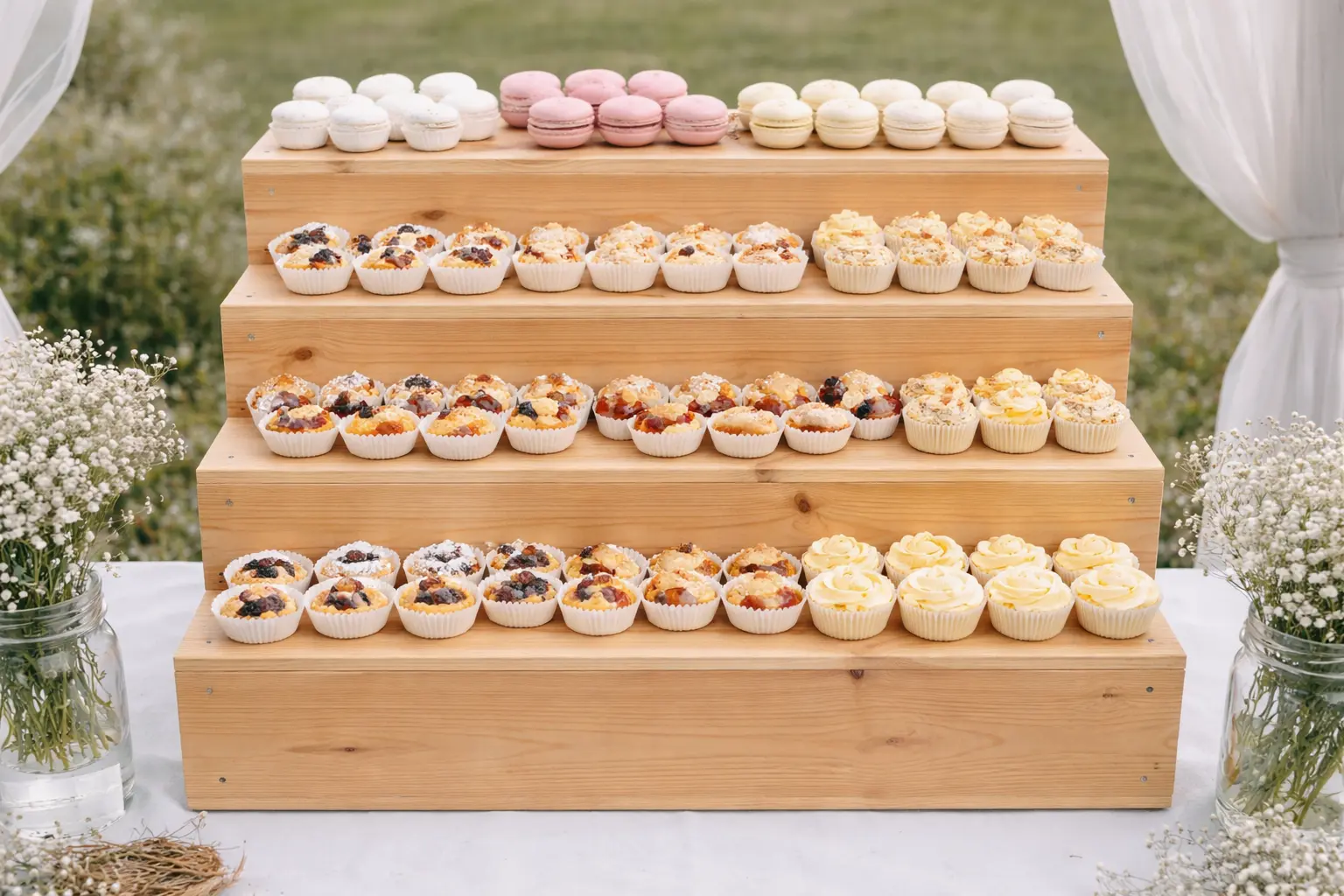 Univerzální dřevěný stojánek na sladký bar nebo raut, na kterém budou vypadat skvěle zákusy, jednohubky nebo cokoli jiného. Rezervovat