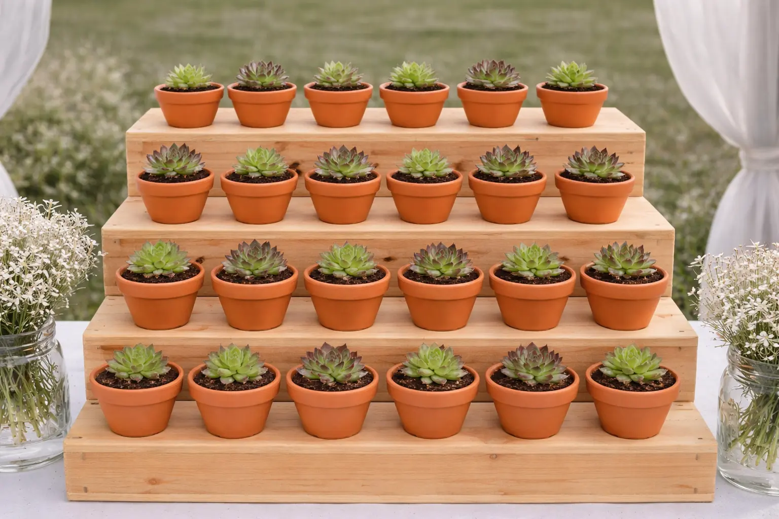 Schody jsou vyrobeny z přírodního dřeva a skvěle zapadnou do rustikální, boho i přírodní svatby. Perfektně se hodí na vystavení koláčků, cupcakes, makronek nebo třeba malých pozorností pro hosty – například sukulentů (netřesků), svíček či balíčků s poděkováním.