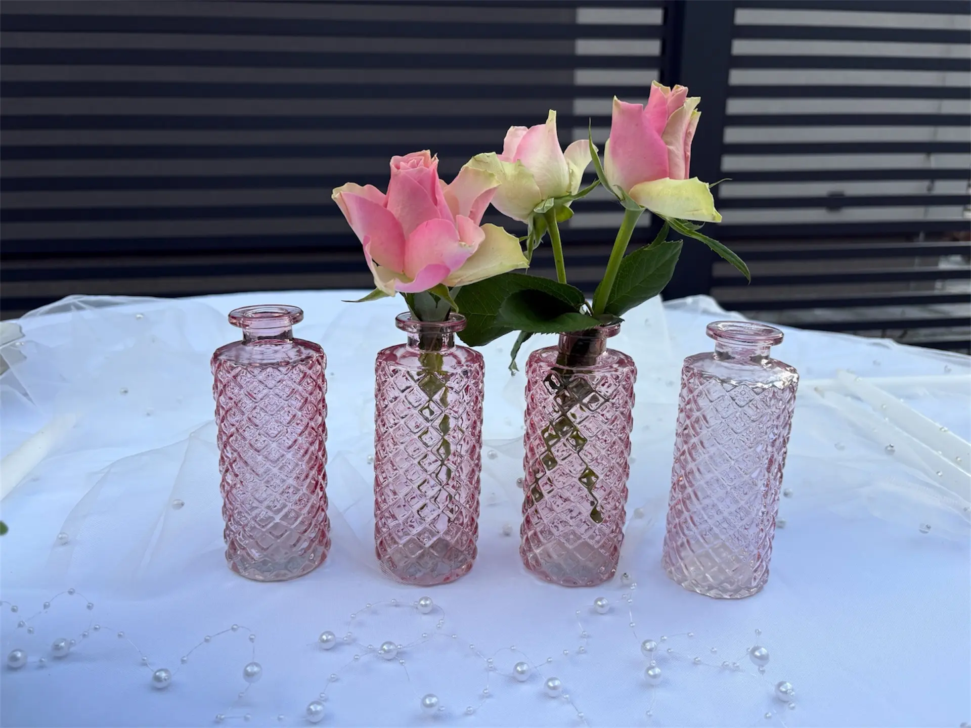 Růžová vintage vázička s jemným reliéfním vzorem je ideálním doplňkem pro svatební výzdobu stolů. Díky svému romantickému odstínu a vintage vzhledu krásně vynikne s čerstvými i sušenými květinami a dodá každému aranžmá něžný a harmonický nádech.