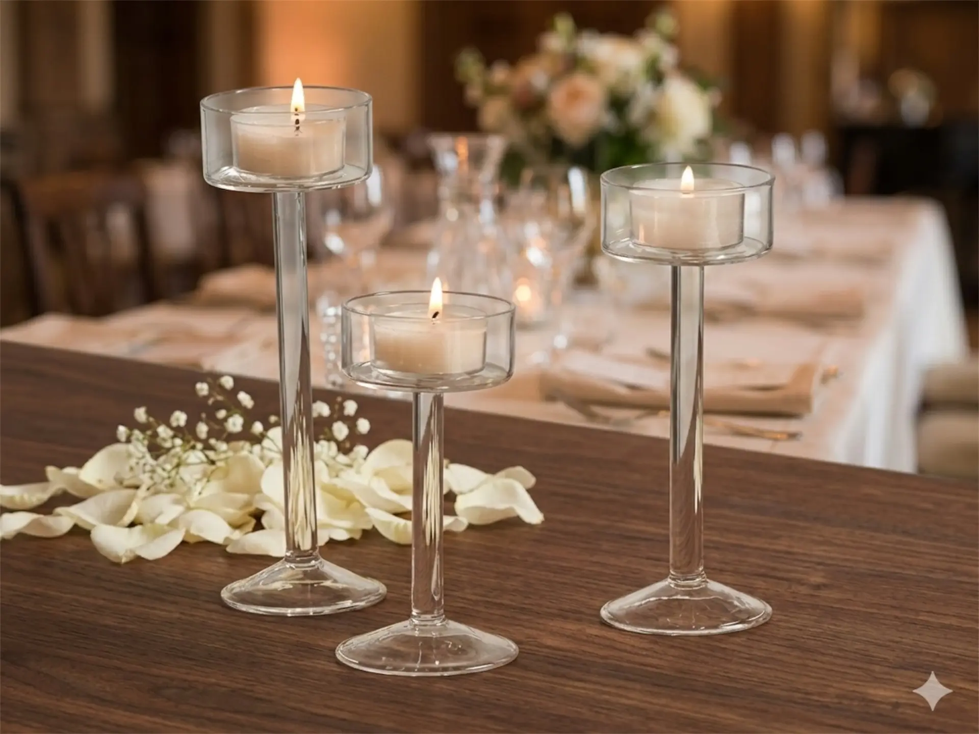 Skleněné svícny na stopce jsou dokonalým doplňkem pro svatební výzdobu i slavnostní tabuli. Vytvoří jemnou, romantickou svatební atmosféru.