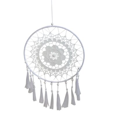 Lapač snů bílé barvy zdobený bílými korálky a střapci. Rezervovat
