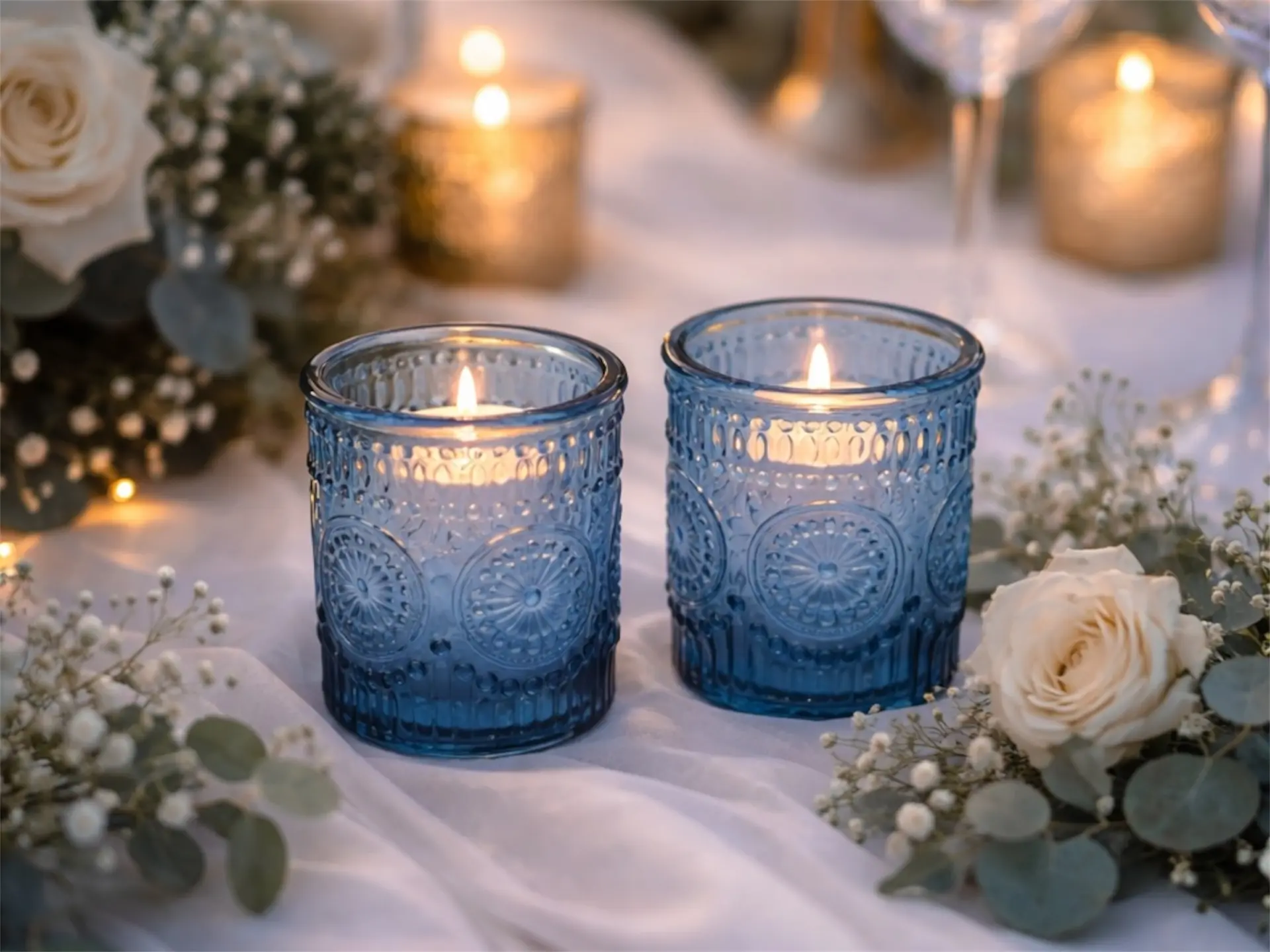 Skleněný svícen na čajovou svíčku v jemném modrém odstínu je krásným doplňkem svatební výzdoby, který dodá stolům romantickou a útulnou atmosféru.