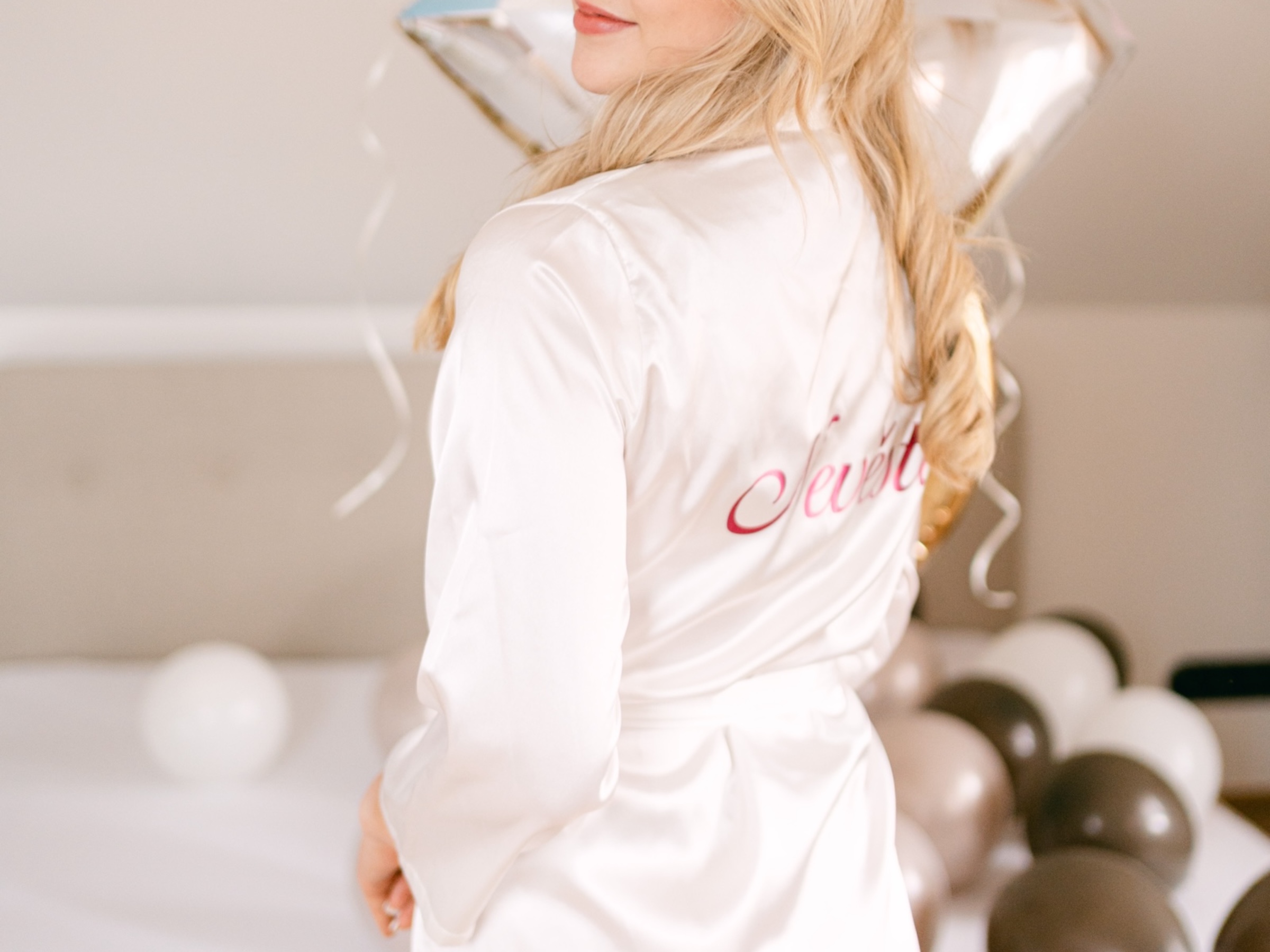 Saténový župánek s fialovým nápisem Nevěsta je dokonalým doplňkem svatebních příprav. Skvěle se hodí na ranní chystání, líčení, česání i romantické fotografie, které zachytí jedinečnou atmosféru vašeho dne. Župánek zapůjčujeme vypraný a připravený k použití. Po svatbě se o jeho praní již nemusíte starat.